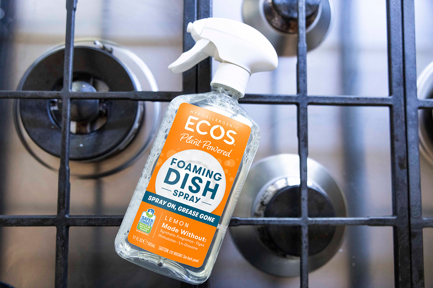 Simply spray the foam onto dirty dishes, wipe, and rinse. For tough grease or baked-on grime, spray and soak before rinsing. Clean greasy kitchen surfaces by spraying directly on the mess and wiping with a damp cloth.