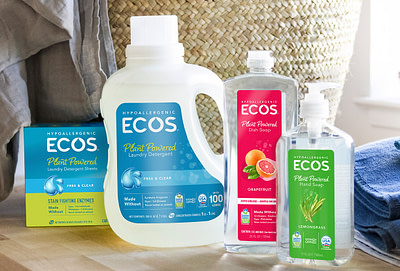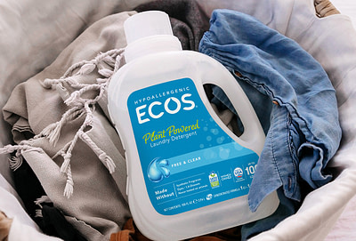 - ECOS Laundry Detergent Bottles made from 100% recyclable plastic, helping to reduce demand for virgin plastic and support circular economy efforts.