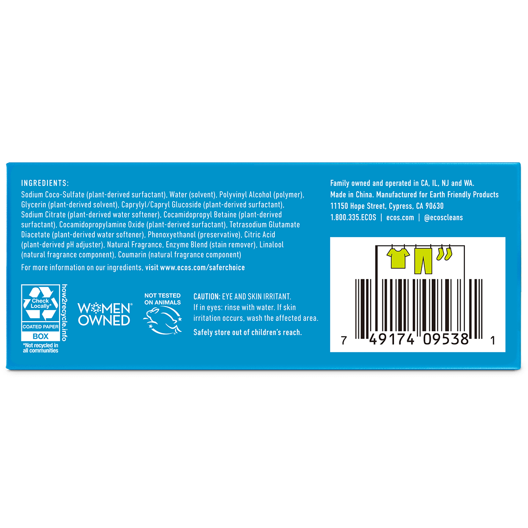 Always follow garment care instructions. Add one sheet with your dirty laundry directly into the washer drum. For hand washing, add directly to water to activate the cleansing power. ECOS Laundry Sheets will dissolve entirely in all water temperatures and are safe to use in high efficiency or standard machines. To take your laundry on the go, make sure to store laundry sheets in a dry, cool place.