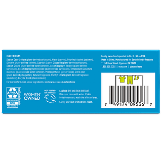 Water (solvent), Polyvinyl Alcohol (polymer), Sodium Lauryl Sulfate (plant-derived surfactant), Kaolin (mineral-based builder), Caprylyl/Capryl Glucoside (plant-derived surfactant), Silica (mineral-based builder), Cocamidopropyl Betaine (plant-derived surfactant), Glycerin (plant-derived solvent), Sodium Citrate (plant-derived water softener), Cocamidopropylamine Oxide (plant-derived surfactant), Phenoxyethanol (preservative), Dimethicone (polymer), Saponins (plant-derived surfactant), Citric Acid (plant-derived pH adjuster), Natural Fragrance, Triethyl Citrate (plant-derived fragrance solubilizer), Protease Enzyme Blend (enzyme stain remover)